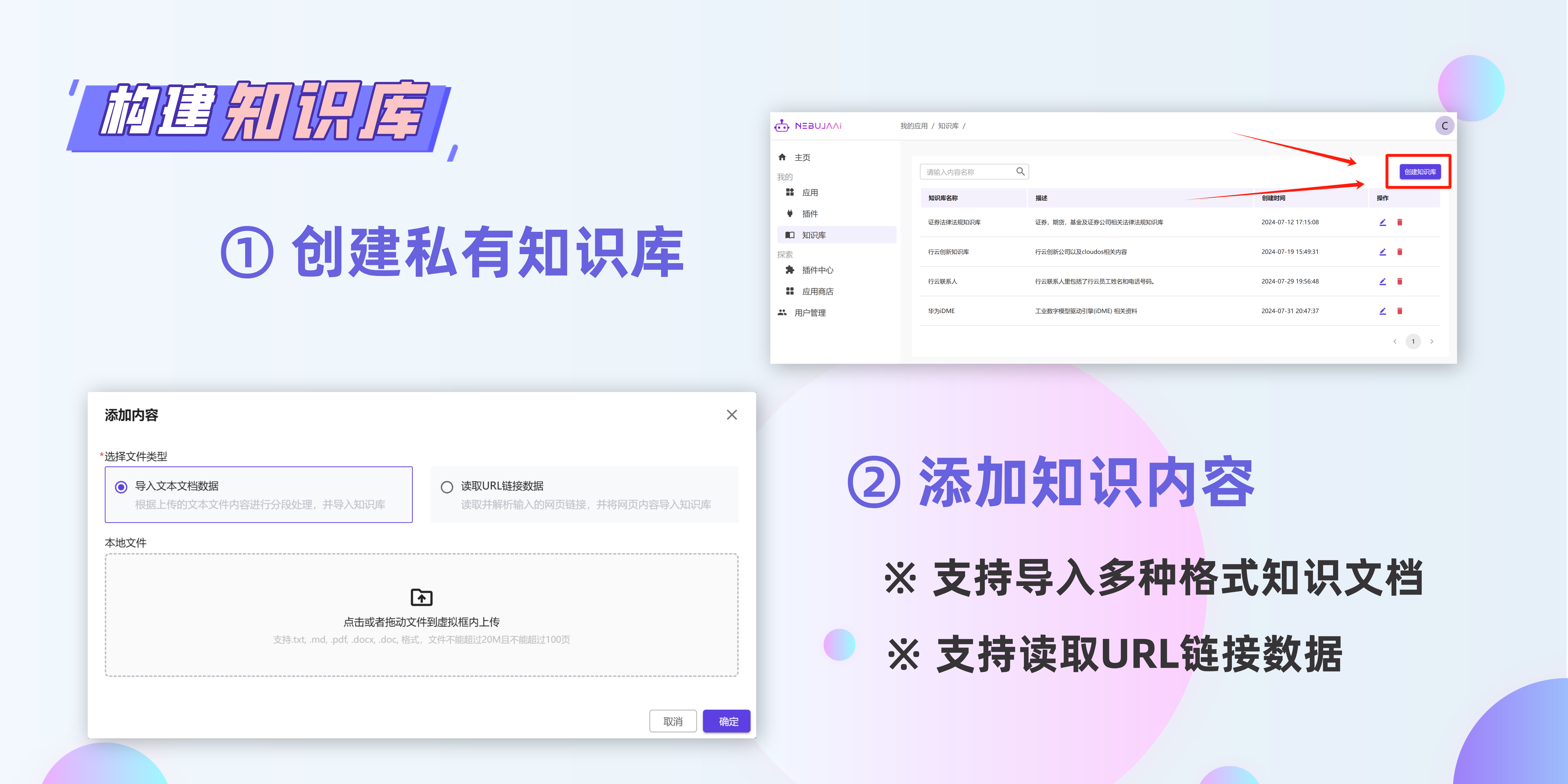 支持上传企业文档数据到私有知识库里,能自动解析理解文档知识,无需费力训练和制作问答语料,即能轻松应对复杂的工作场景和专业性问答。