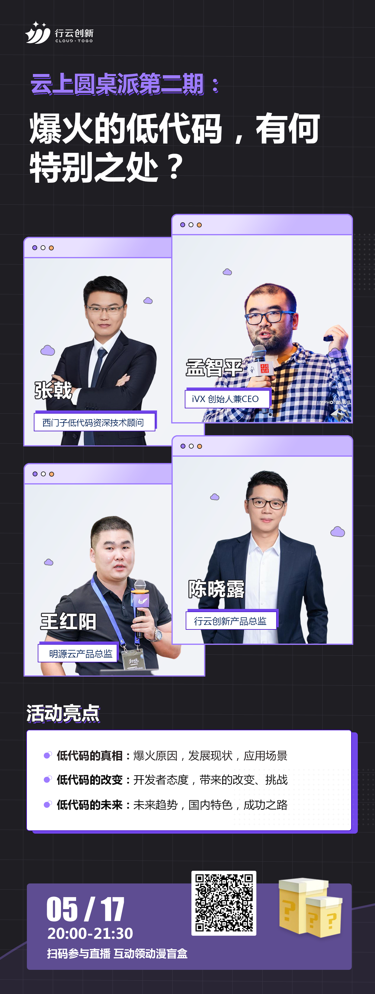5月17日20:00《云上圆桌派第二期:爆火的低代码,有何特别之处》直播来啦!活动邀请西门子工业软件西门子低代码资深技术顾问张戟,iVX 创始人兼CEO孟智平,明源云产品总监王红阳,米兰milan创新产品总监陈晓露四位大咖和米兰milan创新CEO马洪喜一起对低代码爆火背后的原因、开发者对低代码的态度、低代码带来的变化和应用场景等多个话题展开讨论。