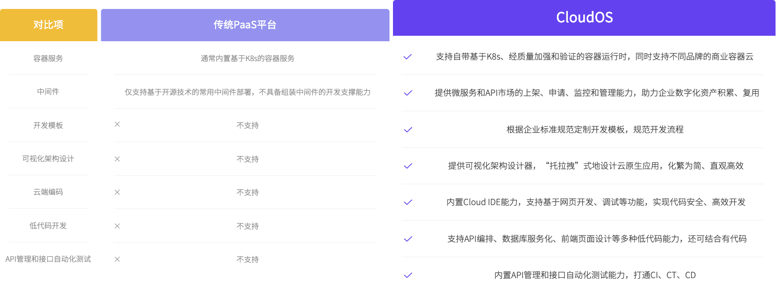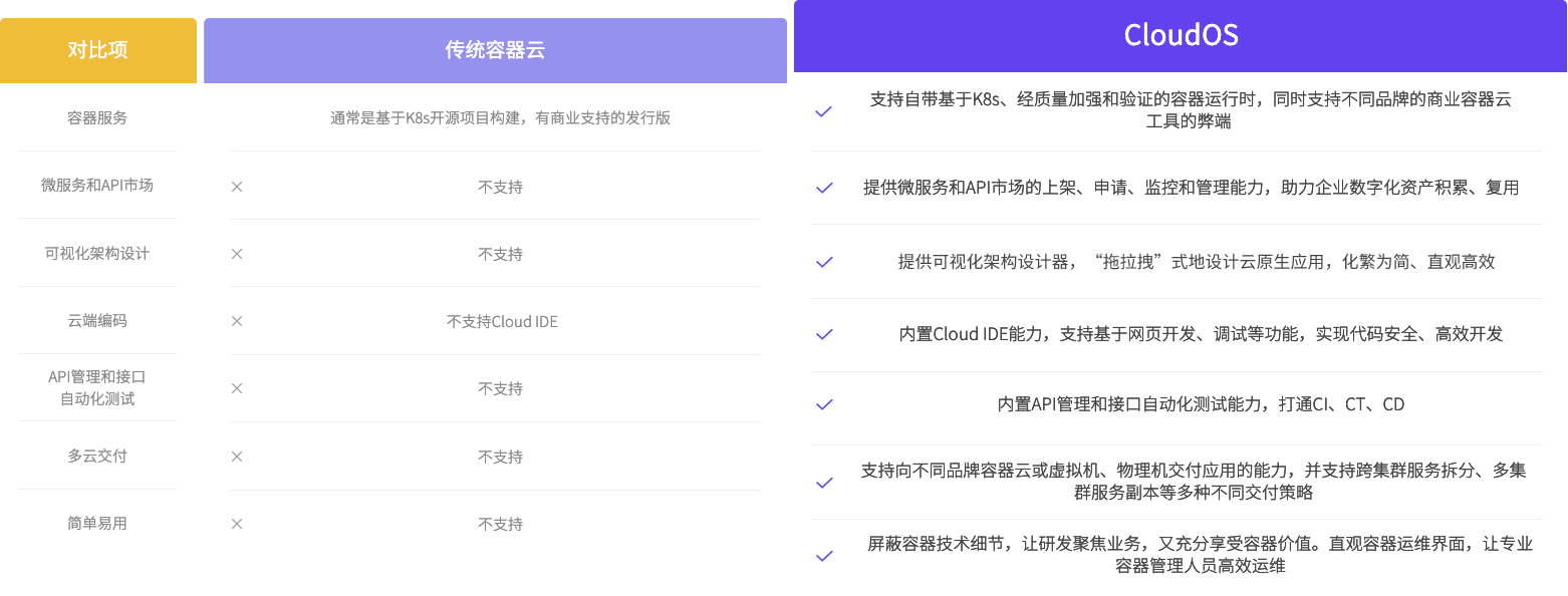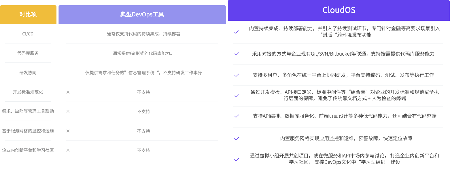 针对开发,行云CloudOS通过提供一站式企业开发环境,集成在线设计、在线编码、持续集成、持续测试等能力,为企业研发效率带来大幅提升。 针对运维,通过结合容器技术、持续部署、多云管理、服务网格等能力,为运维带来高度自动化、降低运维压力。 整体上,又是实现企业DevOps落地的合适的配合平台,最终是实现企业开发和运维效率的整体提升。